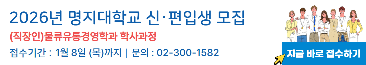 โฆ ๋ก์ง๋ธ๋ฆฟ์ง ๋ฉค๋ฒ์ญ ํ์์ฌ '๋ช ์ง๋ํ๊ต โ๋ฌผ๋ฅ์ ํต๊ฒฝ์ํ๊ณผ' ์๊ฐ: ๋ช ์ง๋ํ๊ต๋ ์ฐ์ ์ฒด ๊ทผ๋ฌด์๋ฅผ ๋์์ผ๋ก 2026๋ ๋ ์ ๊ธฐ ๋ฌผ๋ฅ์ ํต๊ฒฝ์ํ๊ณผ ํ์ฌ(๊ณ์ฝํ๊ณผ) ์ ยทํธ์ ์์ ๋ชจ์งํฉ๋๋ค. ๋ณธ ๊ณผ์ ์ ๊ต์ก๋ถ ์ฐ์ ๊ต์ก์งํฅ๋ฒ์ ๋ฐ๋ฅธ ์ ๋๋ก, ์๋ฅ๊ณผ ๋ฌด๊ดํ๋ฉฐ ํ ์์ผ๋ง ์์ ์ด ์งํ๋ฉ๋๋ค. ์๋๊ถ ์ฐ์ ์ฒด ์ฌ์ง์์๊ฒ ์ ํฉํ๋ฉฐ, ์ด์ฅ ๋ช ์ ํ์ฌํ์ ์ทจ๋, ์ฅํ๊ธ ์ง์, ์ง๋ฌด์ญ๋ ํฅ์ ๋ฑ ๋ค์ํ ํํ์ด ์ฃผ์ด์ง๋๋ค. (๋ ์์ธํ ๋ณด๊ธฐ)